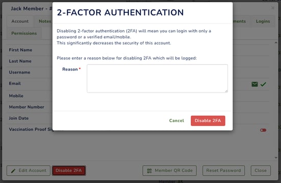 To disable 2FA, the system will prompt you to provide a reason for disabling.