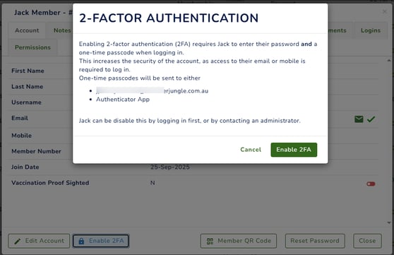 Navigate to the member's account and, under the Account tab, click Enable 2FA.