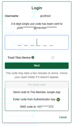 - For the Member Jungle app option, please note that the code is delivered via app notification. You can access the code from your notification banner, and clicking it will open the app directly. The app does not store or save the code. Please ensure that notifications are enabled in your device settings