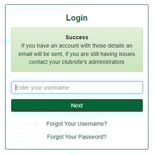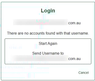 If you enter your email address instead of your actual username, the system will display this message. This will provide you an option to start again or have your username sent to your email address.