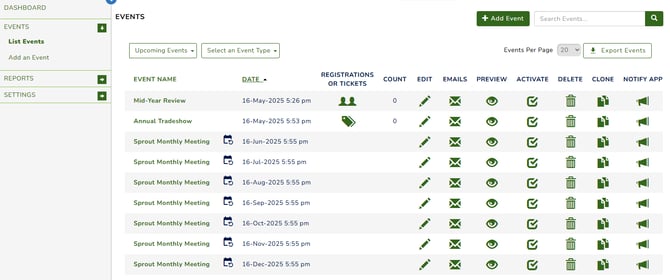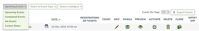 Here’s how you can manage your events, including activating, editing, deleting, approving, cloning, filtering, and exporting them.