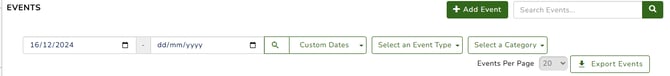 You can filter your events to display only the ones you’d like to see. Filters are available for custom dates, categories, completed and future events, and event types.