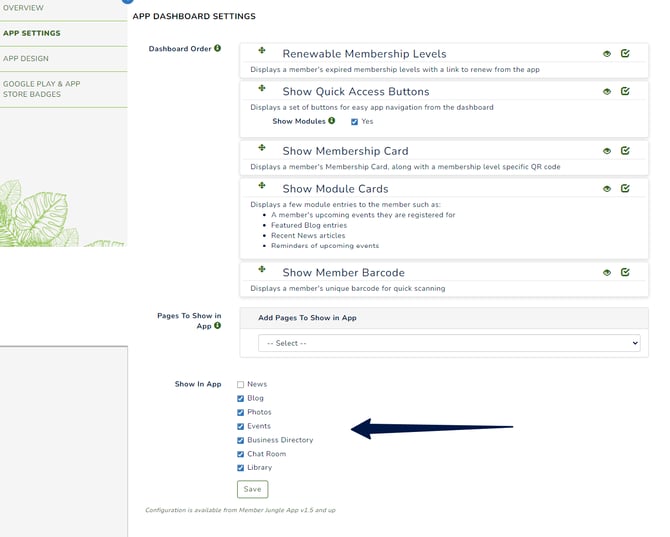 The member jungle app module now has a checkbox setting at the bottom of the "App settings" section, where you can select which modules are displayed in the app. Just tick the box for the corresponding module you would like displayed, then click SAVE.