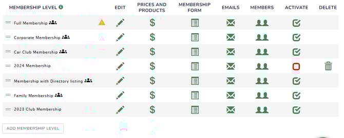 A membership level can only be deleted if no members have purchased a product under it. If there have been no members under the membership level, simply click the delete icon and confirm OK to delete the level. If the delete icon is unavailable it means members have previously purchased products under the level.