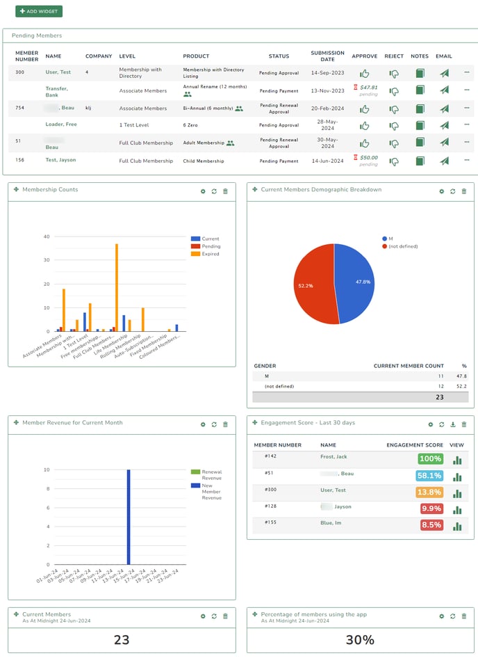 icon at the top of the Membership Overview page. - Select the widget you wish to add to the Dashboard from the list, and click on "+Add Widget"