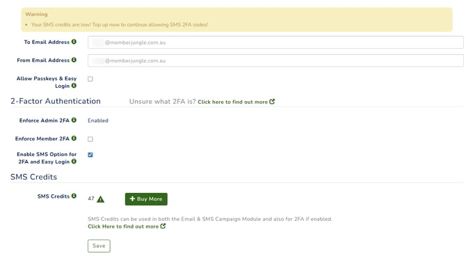 This section, under the Security module, allows you to enable Two-Factor Authentication (2FA) for your members, enable Passkey and Easy Login, and purchase SMS credits.