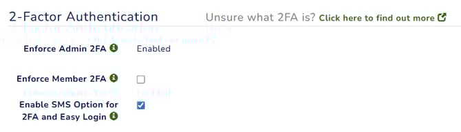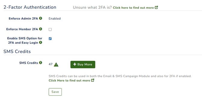 - If you enable the SMS option for 2FA and Easy Login one-time codes via SMS, anyone logging into the system will have the option to receive the code via SMS—provided they have a mobile number saved in their account. Each SMS is charged at 1 credit.