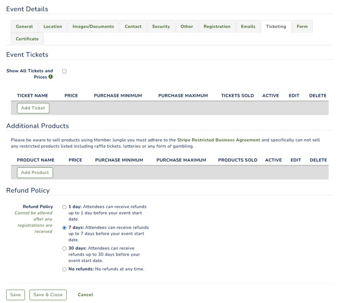 You have the option of allowing refunds up to 1, 7 or 30 days prior to the event start date, or you can opt to not give refunds at all.