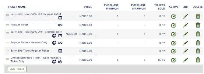Please feel free to hover your mouse over the icons shown on your screen, as this will show a tooltip of how the tickets were configured.