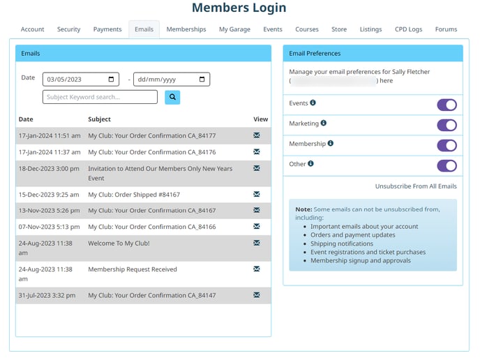 This tab serves as a convenient gateway to access and view all the emails the members received from the club. Make use of the filter feature to easily search for specific emails. Additionally, on the right-hand side of their screen, members will find the option to unsubscribe from various modules. Please see here for more details: Unsubscribe Email